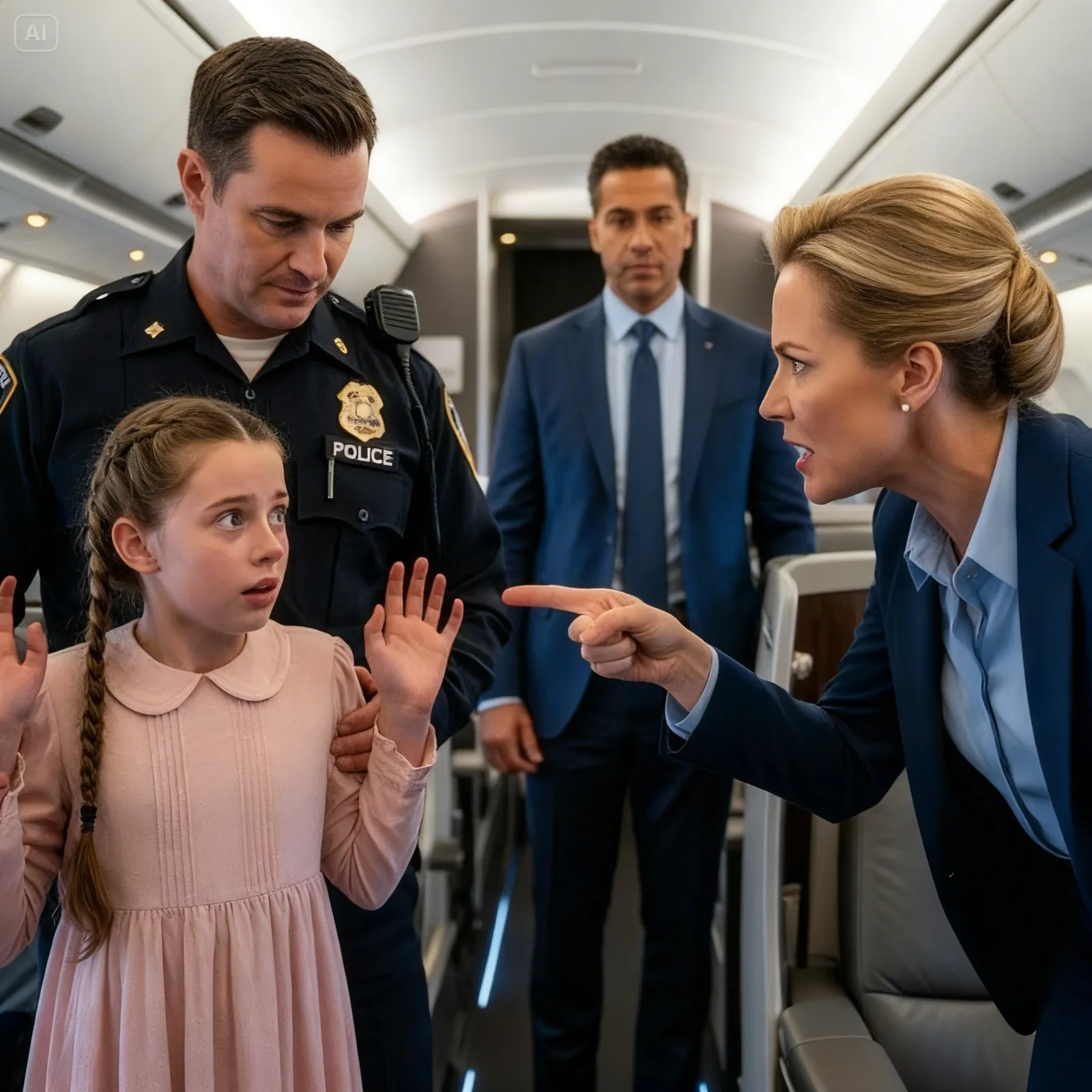 Inside the aircraft, Eliza sat still, hands clasped tightly, trying not to cry. The officer beside her had already arrived, waiting for boarding to complete before questioning the minor. Passengers kept sneaking glances. The flight attendant, Linda, stood off to the side, arms folded, clearly expecting praise for handling the situation.