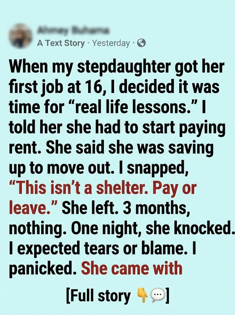 When my stepdaughter turned sixteen and landed her first job, I told myself it was time for “real life lessons.” Her dad worked long hours, money always felt tight, and I was exhausted in that bone-deep way that makes small annoyances feel personal. She talked constantly about saving up, about moving out someday, about not needing anyone. It rubbed me the wrong way, though I never admitted that out loud.