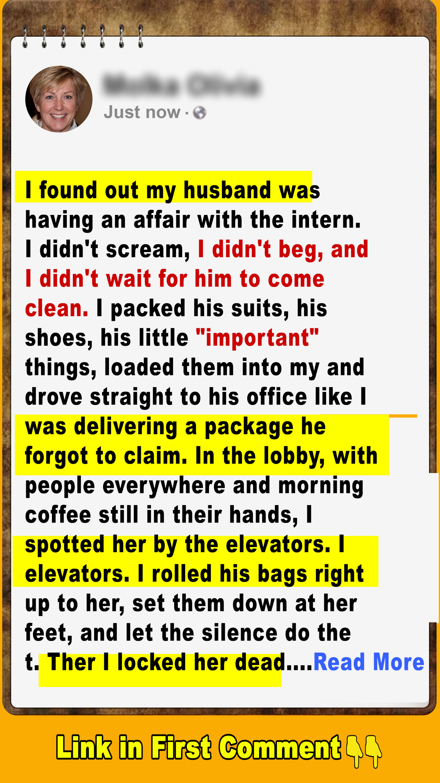I found out my husband was having an affair with the intern. I didn’t scream, I didn’t beg, and I didn’t wait for him to come clean. I packed his suits, his shoes, his little “important” things, loaded them into my trunk, and drove straight to his office like I was delivering a package he forgot to claim. In the lobby, with people everywhere and morning coffee still in their hands, I spotted her by the elevators. I rolled his bags right up to her, set them down at her feet, and let the silence do the rest. Then I looked her dead in the eye and said, congratulations—he’s all yours.